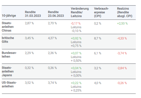 Die Zinserhöhungen der westlichen Notenbanken wurden fortgesetzt. Die EZB reduzierte die Zinsschritte von zuvor 0,50% auf 0,25% (aktuell 4,00%). Die US-Notenbank verzichtete bei der jüngsten Sitzung des Offenmarktausschusses auf einen Zinsschritt, verwies aber darauf, dass zwei weitere Schritte bis Jahresende folgen könnten (aktuell 5,00% – 5,25%). Die Bank of England sah sich wegen hartnäckigen Inflationsdrucks genötigt, den Leitzins im Juni um 0,50% auf 5,00% zu erhöhen, während die Notenbank Japans weiter auf Zinserhöhungen verzichtet (-0,10%).